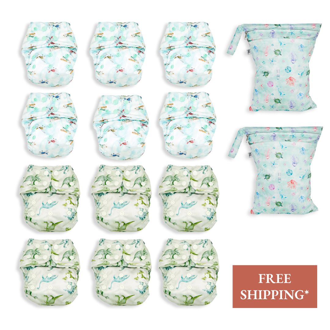 The bundle includes 12 modern cloth nappies and 2x standard sized baby wet bags.